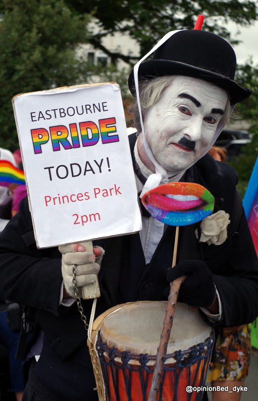 Charlie Chaplin at Pride- 5631 Charlie Chaplin at Pride- holding an Eastbourne Pride sign. Big lips and drum Posted on July 24, 2017August 1, 2017