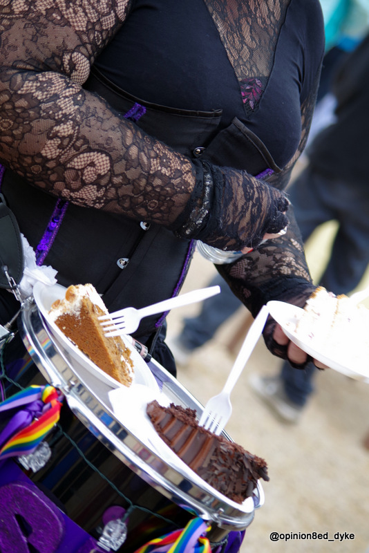 portions of cake sat atop a drum, decorated with LGBT rainbow ribbon, being worn by a woman in black lace after the Eastbourne Mardi Gras Pride Parade